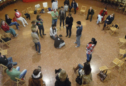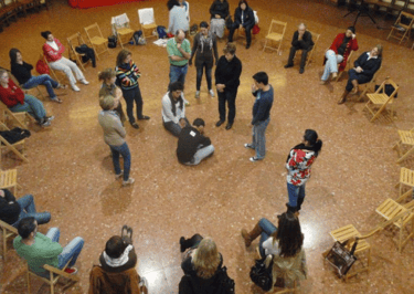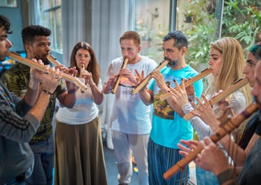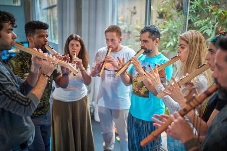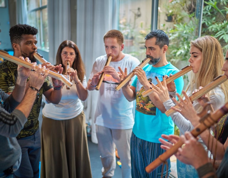 Dinâmicas em grupo envolvendo foco, concentração, respiração, colaboração, trabalho em equipe, eficiência, produtividade, controle emocional, e muito mais através de práticas corporais rítimicas e com instrumentos musicais.